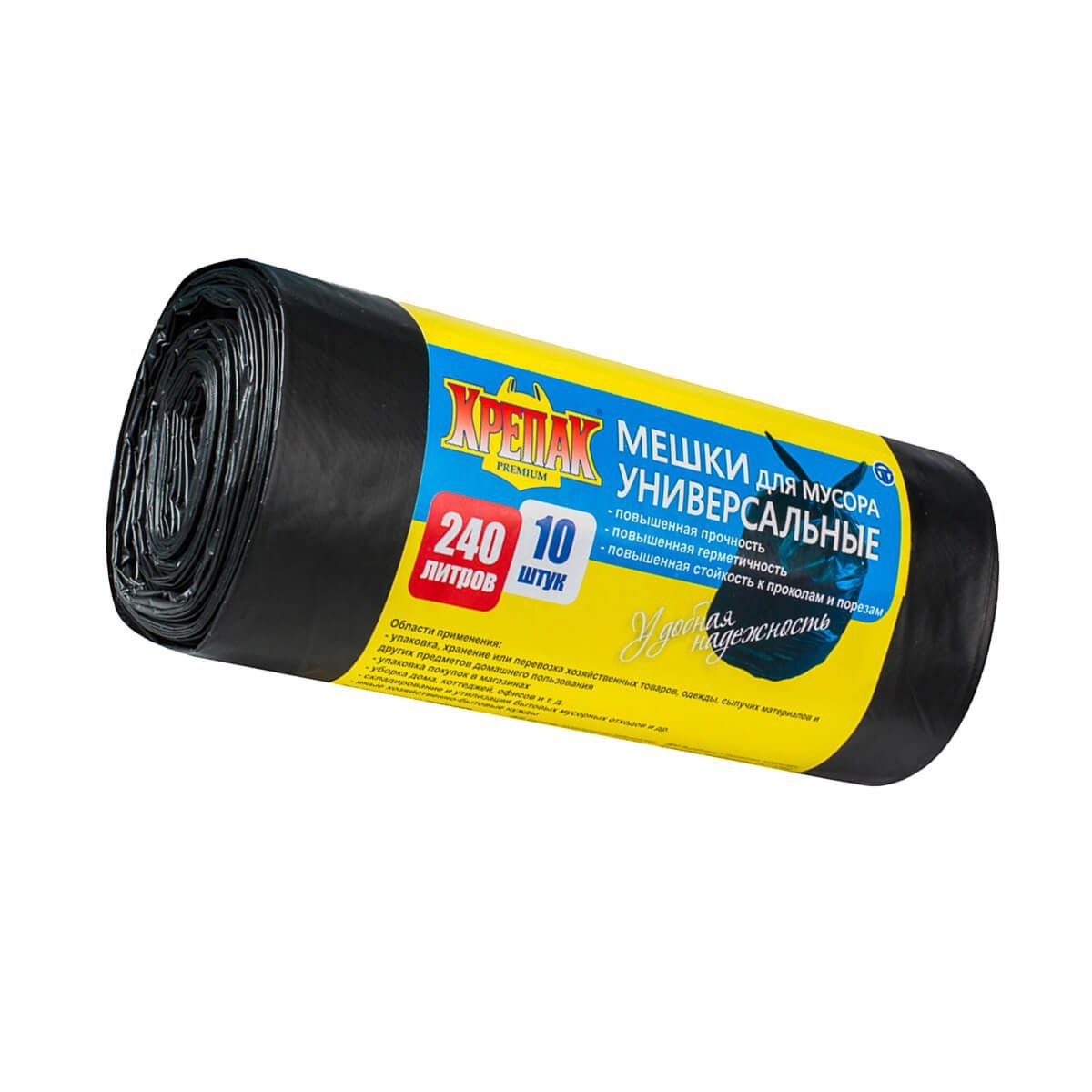 Мешки для мусора 240 л, черные, в рулоне 10 шт., ПНД 40 мкм, 1250х1000 мм, Крепак, 4607075710153