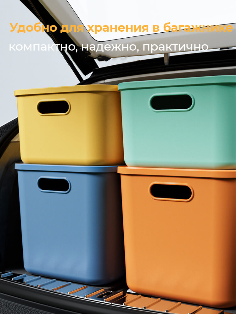 Благодаря вкладываемой конструкции, ящики занимают минимум места в пустом состоянии, а с крышкой их можно штабелировать, создавая аккуратную систему хранения. Открытые ручки упрощают переноску.