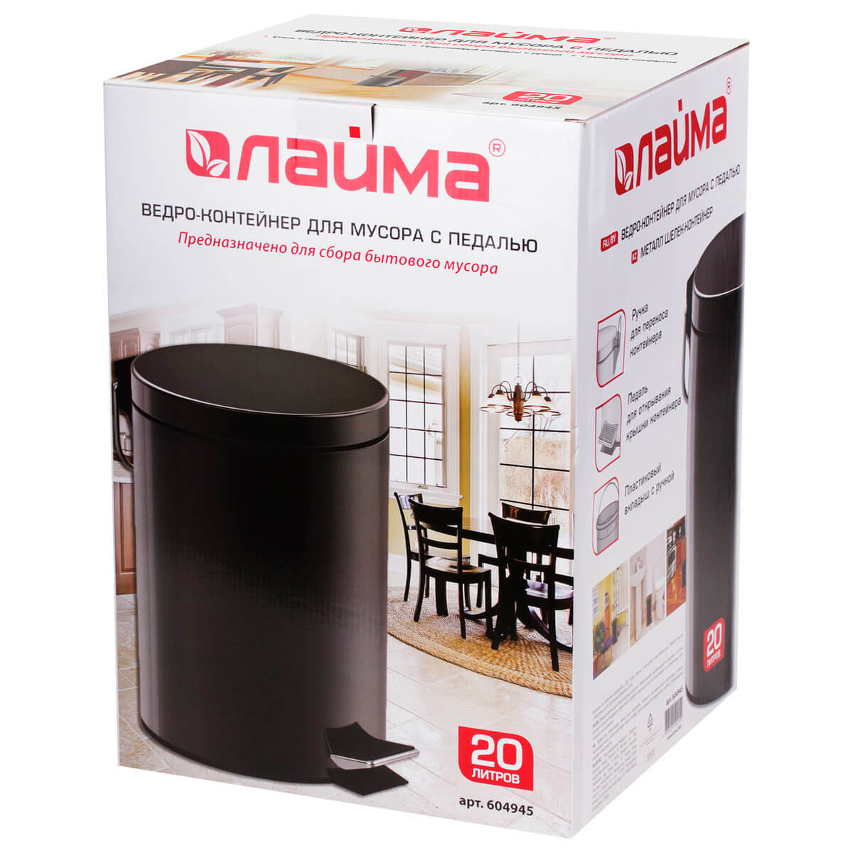 Ведро-контейнер для мусора (урна) с педалью LAIMA Classic, 20 л, черное, глянцевое, металл, со съемным внутренним ведром